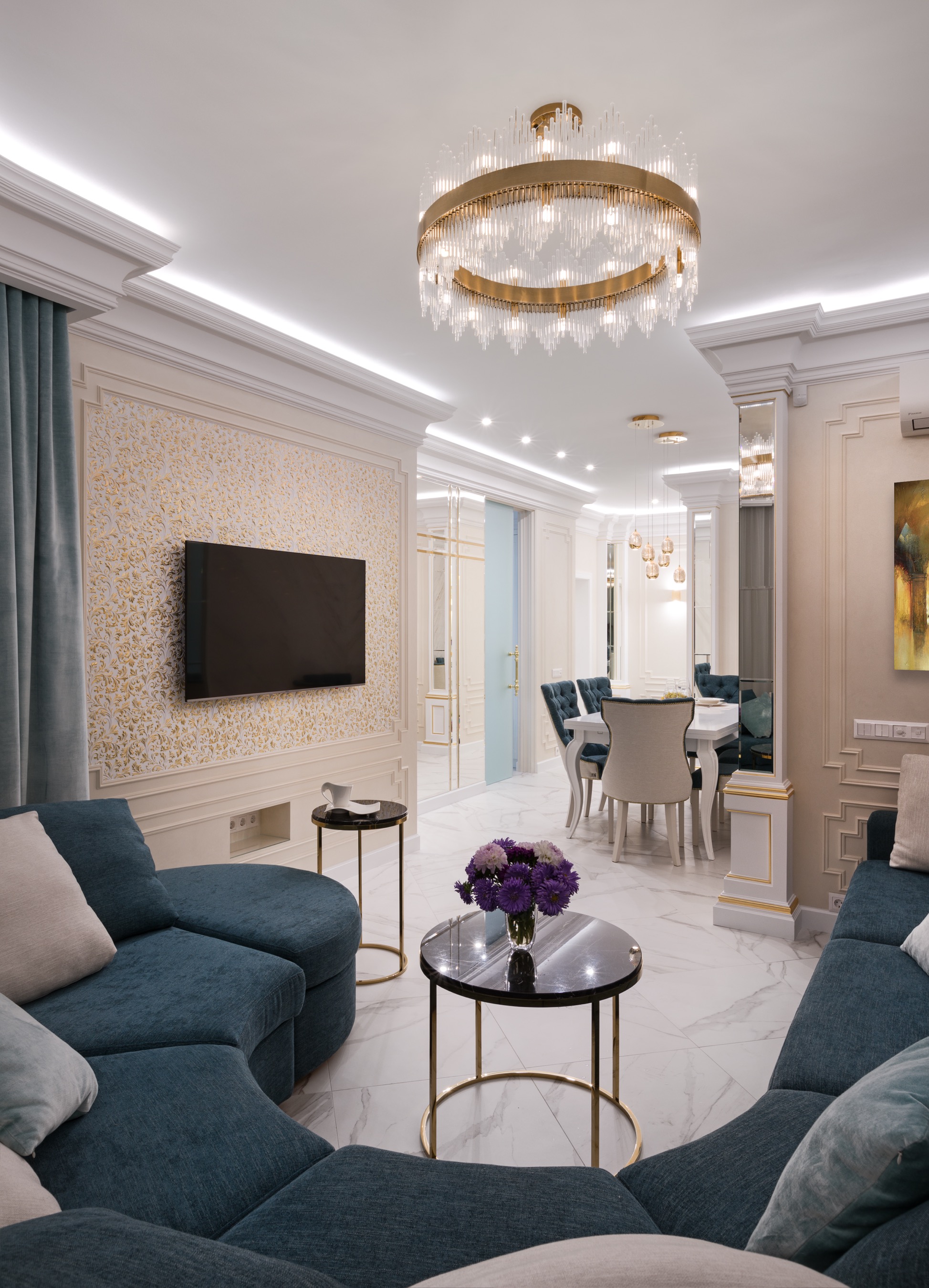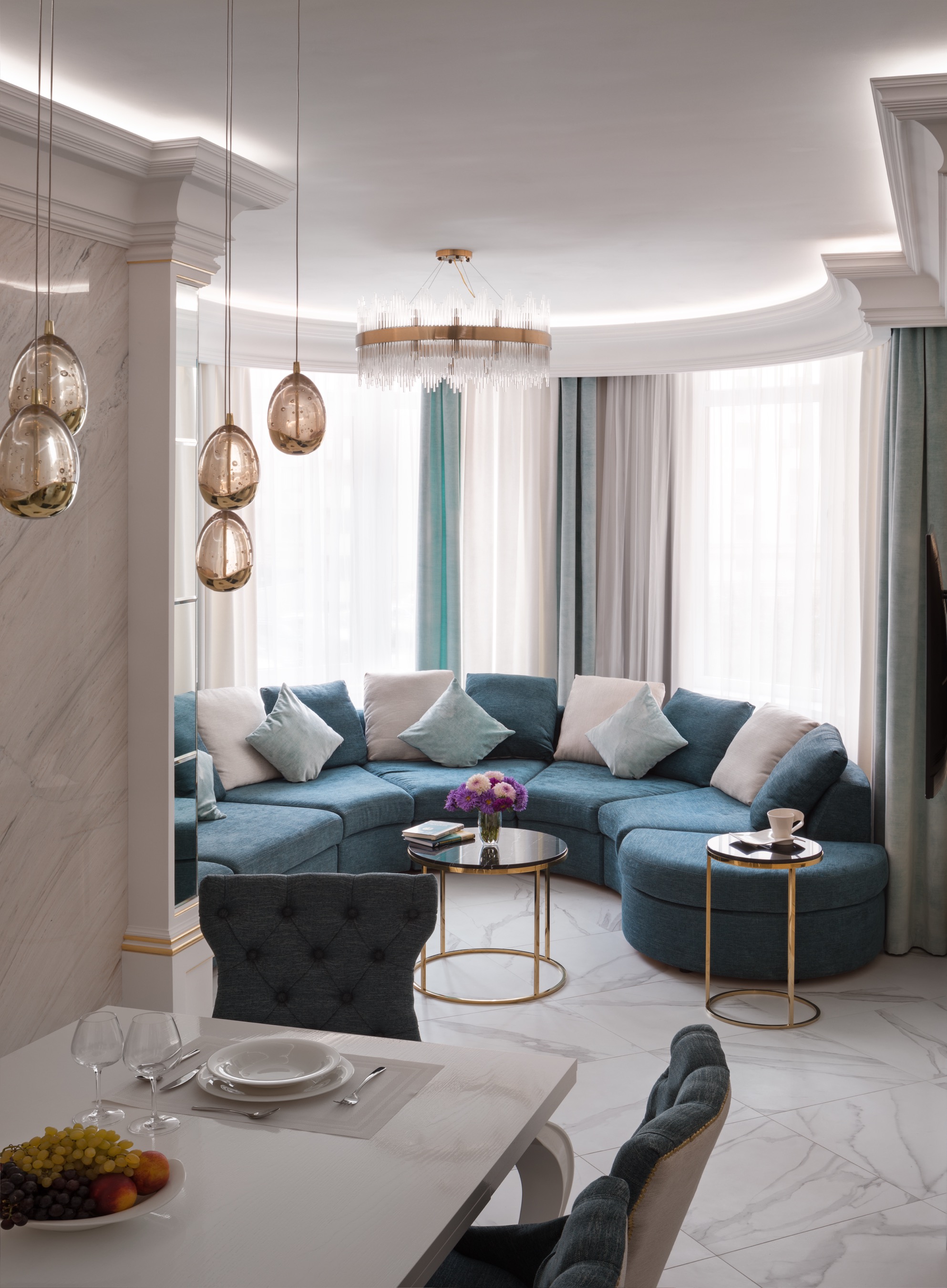 Обідні клісла ручної роботи в одній тканині з радіусним диваном для зони вітальні.